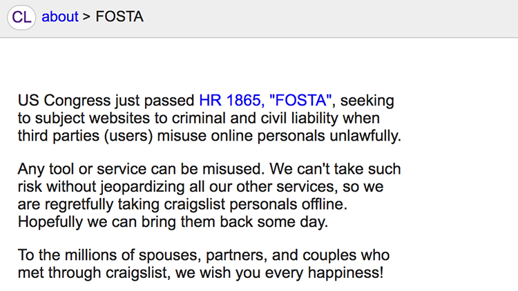Here is the message that Craigslist put online, in place of their “personals” section: